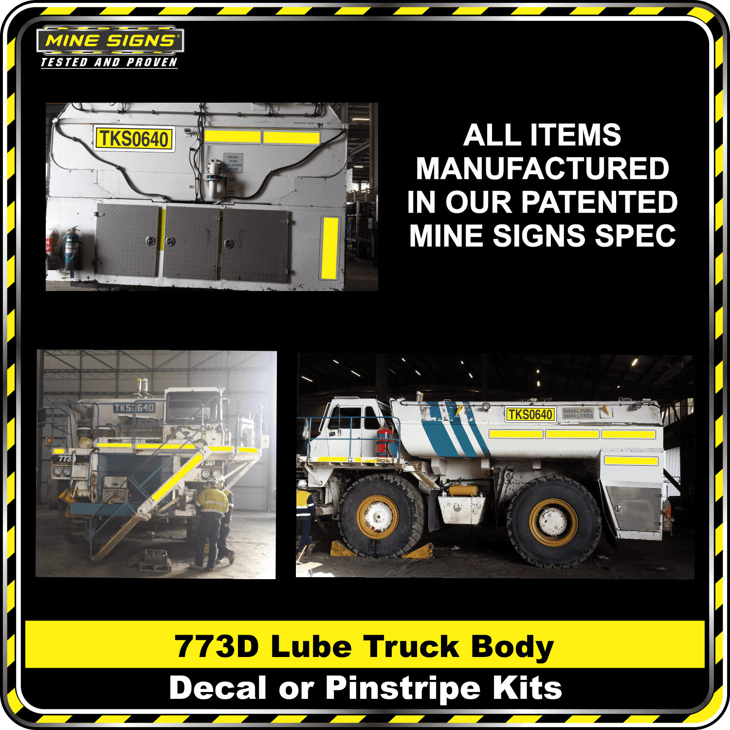 Tags: 3M, 773D, Adhesive, Body, Call ID, Call Number, Cat, Caterpillar, Fluoro Yellow Green, Fluro Yellow Green, Heavy Vehicle, Hi Vis, High Vis, Lube Truck, Mine Signs, Mine Signs Spec, Pin Stripe, Pinstripe, Reflective, Stripe, Vehicle, Yellow